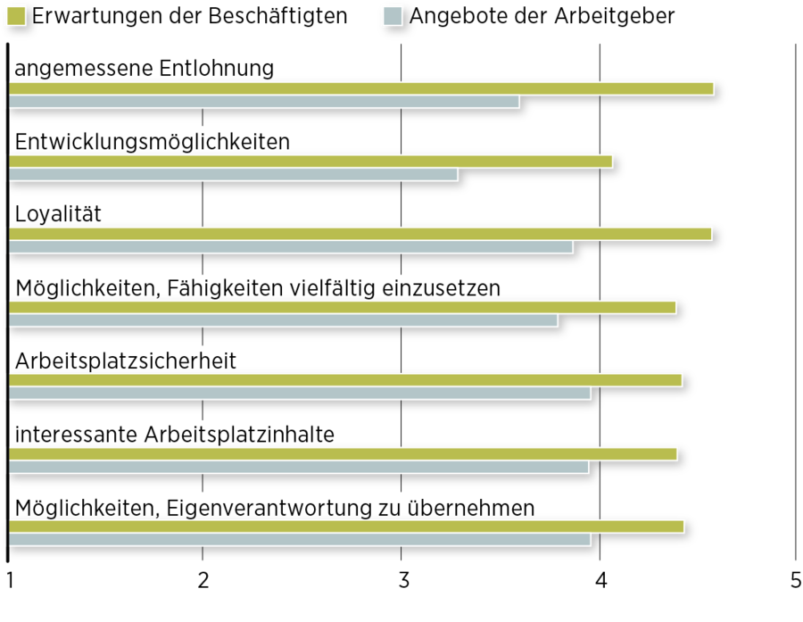 Das HR-Barometer weist darauf hin, dass Firmen die Erwartungen der Mitarbeitenden zu wenig beachten. Die Kluft zwischen Erwartetem und Gebotenem vergrössert sich seit Jahren – vor allem, was angemessenen Lohn und berufliche Entwicklungsmöglichkeiten betrifft.