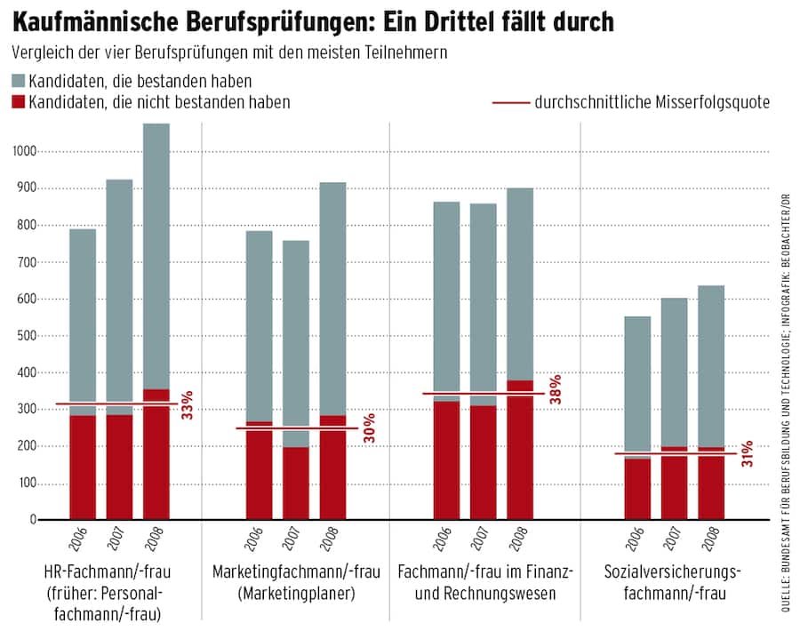 Dass 2008 gesamtschweizerisch sage und schreibe 42 Prozent der Kandidaten die Prüfung nicht bestanden haben, gibt denn doch zu denken. Besonders wenn man weiss, dass die Misserfolgsquote bei anderen kaufmännischen Berufsprüfungen ähnlich hoch ist (siehe Grafik). Bei Personalfachleuten beträgt sie 33 Prozent, bei Marketing- und Sozialversicherungsfachleuten je 31. Sie zahlten zusammen fast sieben Millionen Franken Schulgeld.