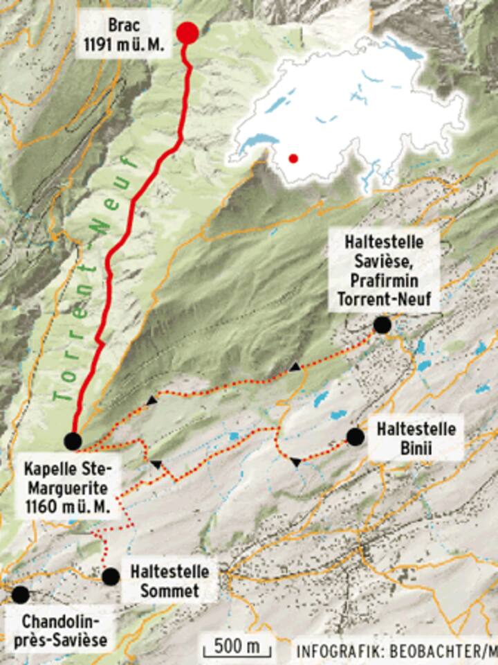 Bis zur Kapelle Ste-Marguerite normale Suonenwanderung durch den Wald (rund 45 Minuten), anschliessend entlang der steilen Felswand (offen seit dem 1. Mai bis 1. November, eine Stunde pro Richtung) und wieder zurück. Mehr Infos unter www.torrent-neuf.ch, weitere Suonenwanderungen unter www.suone.ch und www.suonenmuseum.ch/... (Inventar der Suonen).