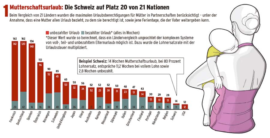 Auch in Sachen Wohlstand, Familien- und Kinderarmut steht die Schweiz verhältnismässig gut da. Genauso, was die steuerliche Belastung der Familien betrifft. Und nicht zuletzt bieten die meisten Grossfirmen von sich aus mehr als nur den gesetzlich geforderten Mutterschaftsschutz von 14 Wochen (siehe «Auszeit für Eltern»).