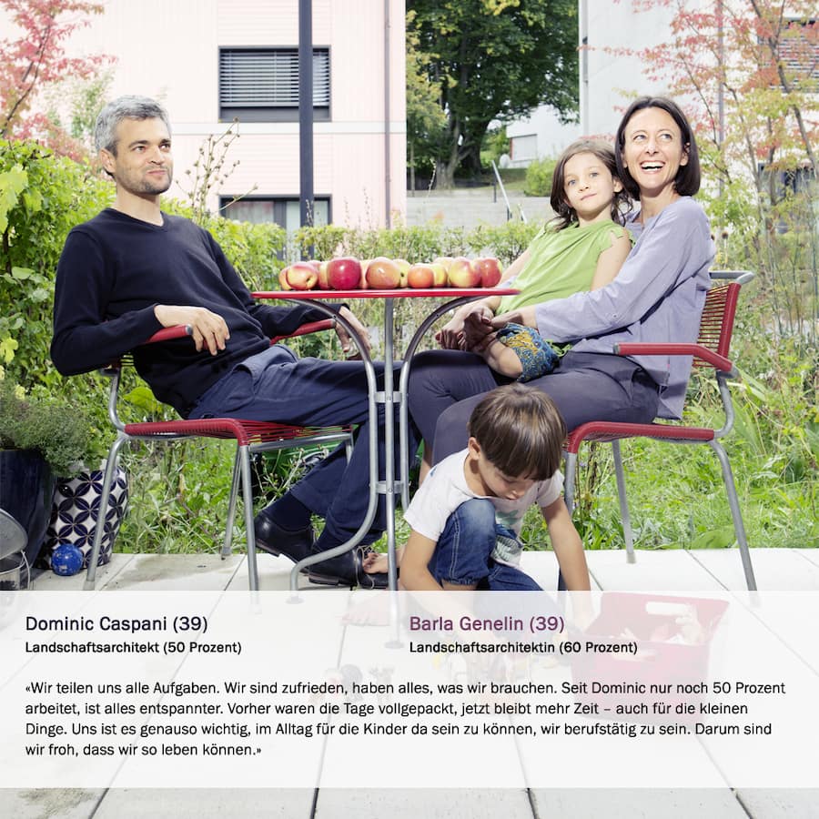Ernst gemacht haben zum Beispiel Dominic Caspani und Barla Genelin. Die beiden Landschaftsarchitekten wohnen mit ihren zwei Kindern in einem Reihenhaus in Zürich. Sie möchten den Kindern bewusst keine fixen Rollenbilder vorleben. Ihr Sohn und ihre Tochter sollen im Alltag erleben, dass Mama und Papa gleichwertig arbeiten und gleich viel für sie da sind. Sie arbeitet 60 Prozent, er 50.