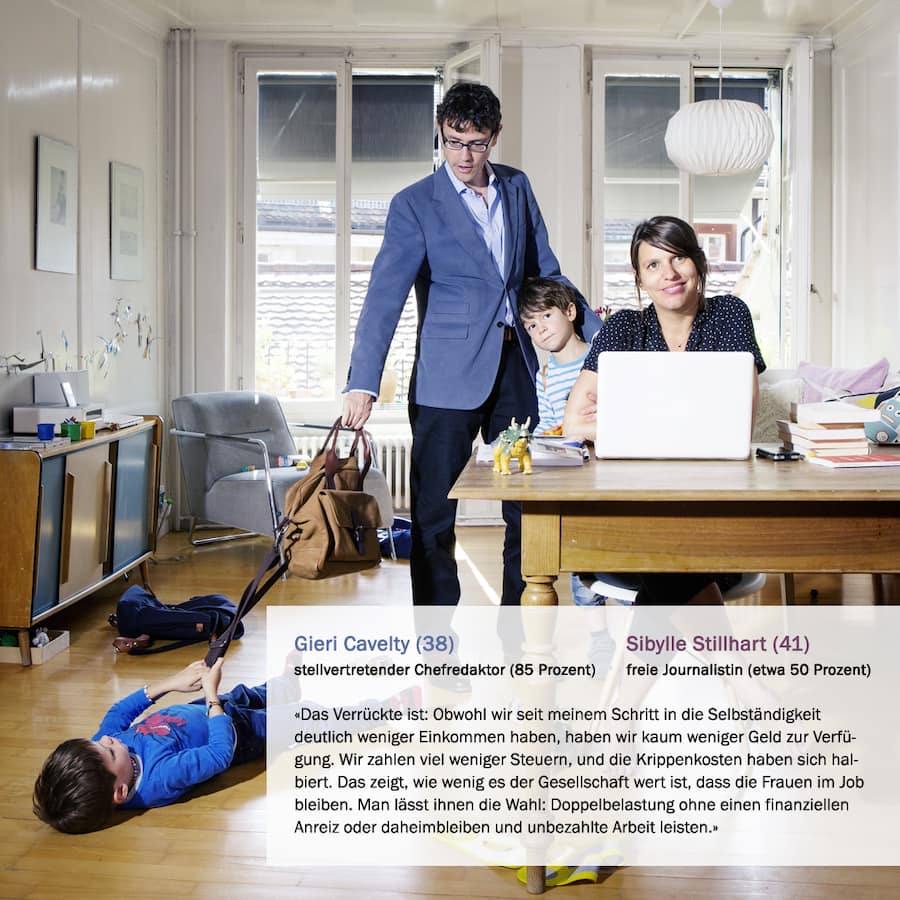 Auch in der Berner Familie Stillhart-Cavelty gibts den Papitag. Sibylle Stillhart arbeitet als freischaffende Journalistin zu Hause, ihr Mann Gieri hat eine leitende Position in einem grossen Schweizer Medienhaus. Bis vor kurzem versuchte Sibylle Stillhart, ihren Kommunikationsjob und zwei kleine Kinder aneinander vorbeizubringen. Als ihre Ärztin sie dann eines Tages besorgt fragte, ob ihr Mann sie genügend unterstütze, schluckte Stillhart leer – und kündigte darauf ihre Stelle.