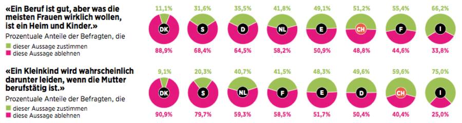 Diese vermeintliche Selbstverständlichkeit sei in der Schweiz fest verankert, fester als in anderen europäischen Ländern, sagt Merz. Eine europaweite Studie zu gesellschaftlichen Werten stützt diese Aussage: Auf die Frage «Leidet ein Kleinkind, wenn die Mutter berufstätig ist?» antworteten in der Schweiz 60 Prozent der Befragten mit Ja. In Dänemark waren es neun Prozent, in Schweden 20. Über die Hälfte der Befragten in der Schweiz sagen, dass es für eine Mutter zwar okay sei, einen Job zu haben, aber Frauen blieben in Tat und Wahrheit doch lieber daheim am Herd.