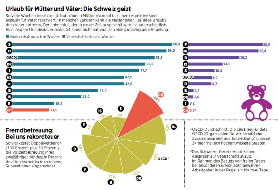Während die meisten Länder des Nordens mehrere Monate Elternzeit anbieten, führt in der Schweiz bereits der Ruf nach ein paar Tagen Vaterschaftsurlaub zu einem Aufschrei, und die Krippenkosten sind rekordverdächtig hoch. Laut einer Umfrage des weltweiten Netzwerks für Expats InterNations hat die Schweiz unter anderem deswegen als Arbeitsort deutlich an Attraktivität verloren.