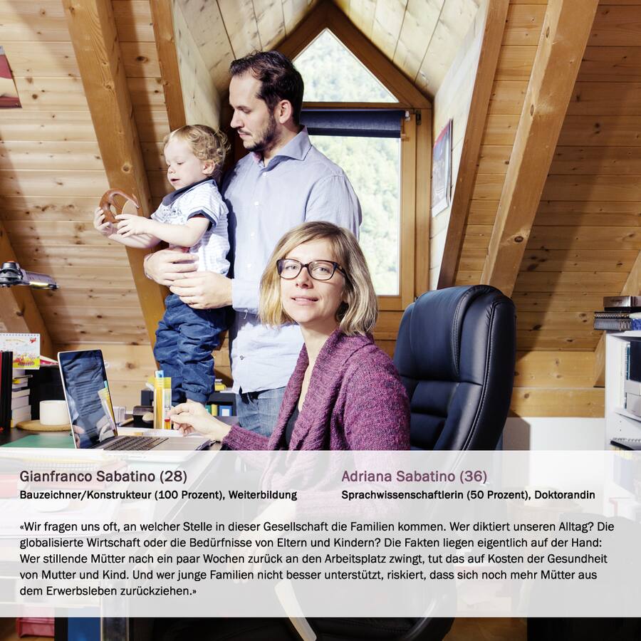 Manchmal sitze sie einfach nur noch fix und fertig auf dem Sofa, sagt Adriana Sabatino, so erschöpft sei sie. Obwohl ihr Mann mehr mache als andere Väter, sei es halt doch sie, die abends noch die Wäsche mache, die Küche und die familiären Termine im Auge behalte. Gern hätte das Paar ein zweites Kind, aber das, sagen beide, liege kräftemässig nicht drin.