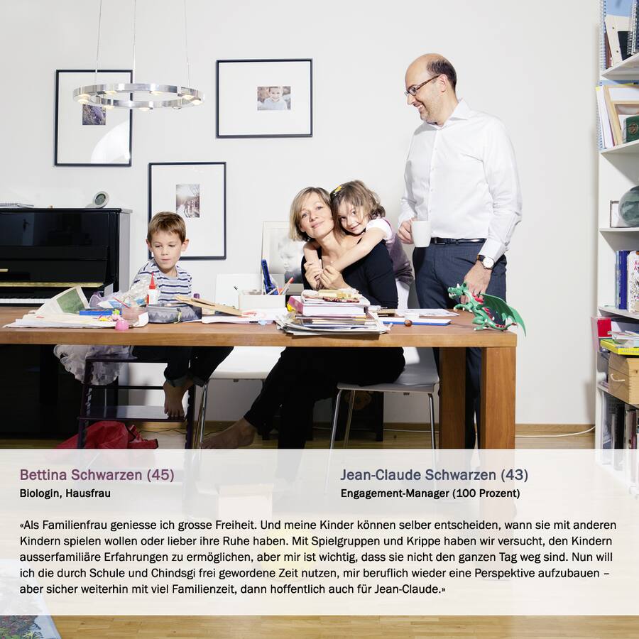 «Natürlich wäre es schön gewesen», sagt Bettina Schwarzen, die Biologie studiert hat, «wenn wir Arbeit und Familie hätten teilen können.» Aber bei ihrem Arbeitgeber war ein Teilzeitjob nicht möglich. Und Jean-Claude Schwarzen, Engagement-Manager in einer Technologiefirma, sagt: «Teilzeitmodelle in meinem beruflichen Umfeld bedeuten meist weniger Geld, aber nur ungleich weniger Arbeit.» So kam es, wie es meistens kommt: Sie stellte die Karriere zurück, und er sieht die Kinder vor allem an den Wochenenden.