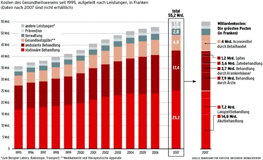 Kosten des Gesundheitswesens seit 1995, aufgeteilt nach Leistungen, in Franken (Daten nach 2007 sind nicht erhältlich)