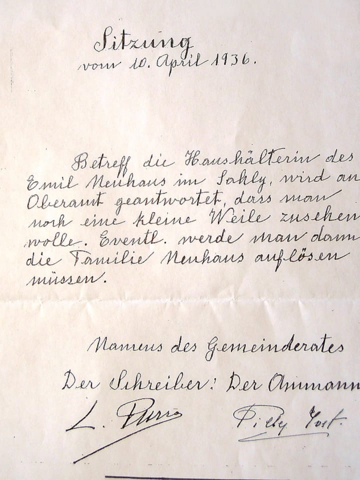 Als Zita Neuhaus 1992 zum ersten Mal an die Gemeinde gelangte, teilte man ihr salopp mit, über ihre Familie gebe es gar keine Dokumente mehr. Vor zwei Jahren verhalf ihr die Opferberatungsstelle zu einem neuen Anlauf. Alles, was die Gemeinde schliesslich herausrückte, waren fünf kurze Gemeinderatsbeschlüsse von 1935 und 1936. Inhalt: Einmal hatte der Grossvater den Pachtzins nicht bezahlt, dann sollte ein Bürge für die Schuld einstehen, dann hiess es, vielleicht müsse man die Familie «auflösen» und die Kinder «ins Waisenhaus verbringen». Schliesslich die Notiz vom 28. Juni 1936 – mit einer Liste, welches Kind zu welcher Familie «in Pension» gegeben wird. Dieser Entscheid führte zur öffentlichen Verteilaktion.