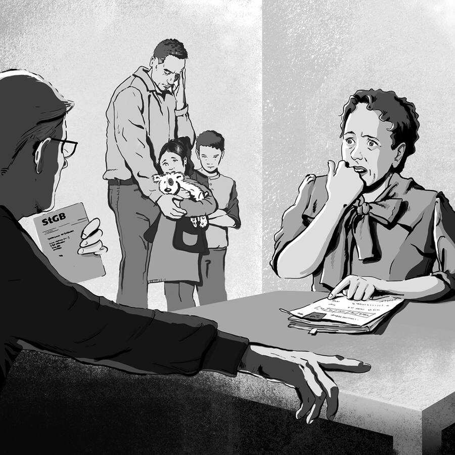 José Zuniga, Agnes Nagy und Lorena Rossi* (v.l.) – Drei Fälle, die zeigen, dass die Durchsetzungsinitiative ihr Ziel verfehlt. (Illustration: Regina Vetter)