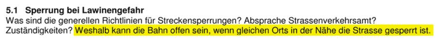 Die Fahrt durch Lawinenhänge sorgte gemäss einem Insider im vergangenen Winter für Unmut unter den Lokführern. Im Protokoll einer Sitzung des Lokpersonal-Ausschusses der Personalkommission heisst es: «Als Beispiel wird eine Strassensperrung bei Disentis über die Festtage erwähnt, während der bei der RhB im gleichen Lawineneinzugsgebiet die Strecke offen war. […] Weshalb kann die Bahn offen sein, wenn gleichenorts die Strasse gesperrt ist?» Laut Protokoll fiel die Rückmeldung der RhB lapidar aus: Sie wolle «die Zusammenarbeit mit dem Kanton» intensivieren. Nach einem durchdachten Lawinenkonzept klingt das nicht gerade.