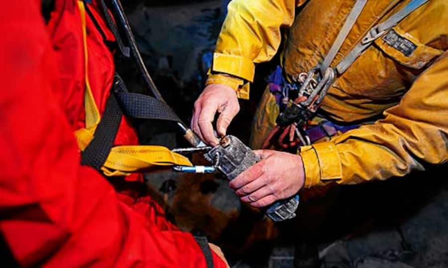 60 Meter seilen sich die Forscher zum Höhleneingang ab.