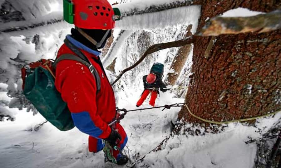 Als Stephan Billeter kurz vor acht Uhr morgens seinen Kleinbus parkiert, weht ein eisig kalter Wind durch das halboffene Parkhaus bei der Luftseilbahn Hoch-Ybrig SZ. Es ist Samstag vor Weihnachten und einer der kältesten Tage des Jahres. Minus 14 Grad zeigt das Thermometer. Die ersten Skifahrer stöckeln bereits Richtung Seilbahn. Stephan Billeter (39) aber holt nicht Skier aus dem Bus, sondern Klettermaterial, einen Helm und farbige Packsäcke aus PVC. Dann zwängt er sich in einen gelben, mehrfach geflickten Ganzkörperanorak, zieht Gummistiefel an und eine modisch etwas zweifelhafte Roger-Staub-Mütze. Als die Kollegen eintreffen, ist Billeter, hochmotiviert wie immer, längst bereit für das Abenteuer, das oben am Berg auf ihn wartet.