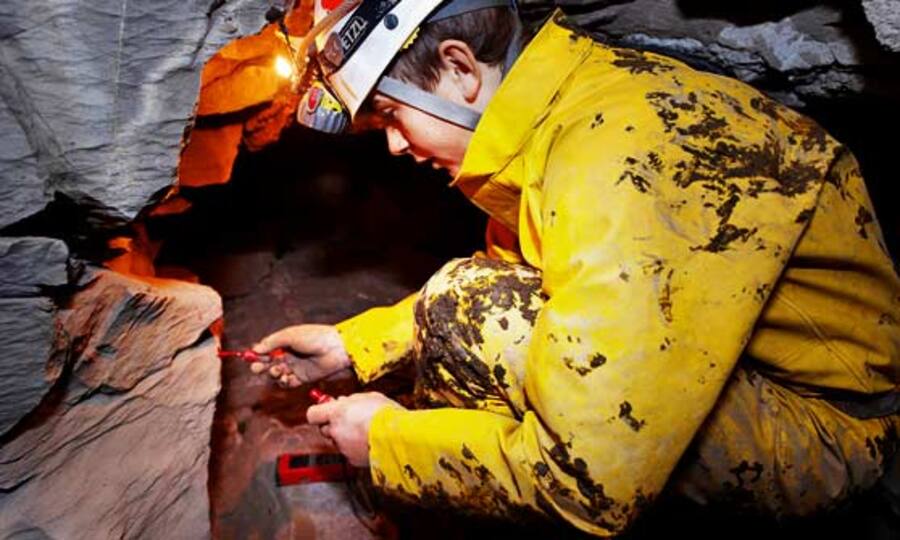Systematisch arbeiten sich der junge Kälin und sein Partner immer tiefer in den Seitengang vor. Das zweite Vermessungsteam ist in der sogenannten «Todeszone» am Werk. Den finsteren Namen führt dieser Höhlenabschnitt, weil die Gänge hier im Sommer regelmässig mit Wasser gefüllt sind. Davon zeugen zurzeit nur drei kleine Seen – und der Dreck, der sich auf den Kleidern absetzt.