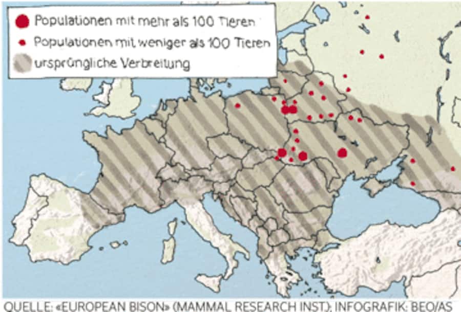 In Freiheit überlebt die Art schliesslich nur in zwei Gebieten: im Kaukasus und im Wald von Bialowieza in Ostpolen. Dort hätschelt man sie, damit Könige, Kaiser und Zaren sie exklusiv bejagen können.