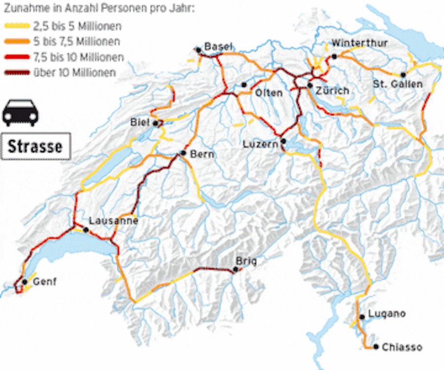 35 Millionen Stunden haben Autofahrer 2005 stehend verbracht – 75 Prozent mehr als zehn Jahre zuvor. Die Kosten für Arbeitsausfälle sowie die Energie-, Umwelt- und Unfallkosten belaufen sich gemäss Schätzungen des Departements für Umwelt, Verkehr, Energie und Kommunikation (Uvek) auf jährlich gegen 1,5 Milliarden Franken. Dagegen treten Bund, Kantone und Gemeinden mit massiven Investitionen an. 180 Milliarden sollen es bis 2030 für Ausbau und Unterhalt der Strassen sein, rund 80 Milliarden für die Bahn.