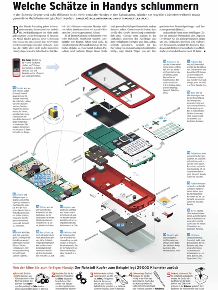 Im Abfall landet gemäss einer Schätzung von Nokia nur ein kleiner Teil; 40 Prozent werden weitergegeben oder verkauft – und fast die Hälfte aller nicht mehr benutzten Handys lagern in den Schubladen. Bei jährlich 2,8 Millionen verkaufter Handys dürften sich in den Haushalten zirka acht Millionen alte Geräte angesammelt haben. In all diesen Geräten schlummern wertvolle Rohstoffe. Rezykliert werden Edelmetalle wie Kupfer, Silber und Gold. In Handys stecken aber auch mehr als 20 exotische Metalle, so etwa Tantal, Indium, Palladium und Gallium. Einige dieser Stoffe sind gesundheitlich problematisch, andere äusserst selten. Gemeinsam ist ihnen, dass sie für die Handy-Herstellung unentbehrlich sind. «Gerade beim Indium ist das Verhältnis zwischen der Nachfrage und den verfügbaren Mengen aus dem Abbau kritisch geworden, deshalb ist das Recycling von indiumhaltigen Geräteteilen nötig», sagt Patrick Wäger von der Eidgenössischen Materialprüfungs- und Forschungsanstalt (Empa). Indium ist in Formeines leitfähigen Glases ein zentraler Bestandteil des Displays. Der Bedarf hat die Jahresproduktion längst um ein Vielfaches überholt. Die weltweiten Ressourcen, schätzt die deutsche Bundesanstalt für Geowissenschaften und Rohstoffe, reichen höchstens noch 15 Jahre.