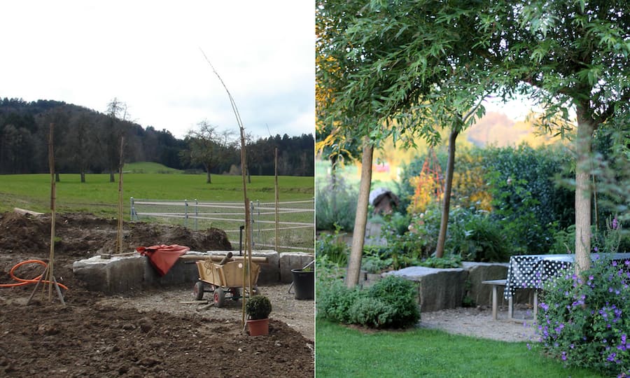 Für die Einarbeitung des Materials mieteten Siegrists Maschinen beim Gartenbauer. Einige Baumaterialien bekamen sie sogar umsonst: Bei einer Strassensanierung wurden Randsteine entfernt und für den Steinhacker parat gemacht. Rolf Siegrist fragte bei der Baufirma an – und bekam die Steine. Er umfasste damit alle Beete. Die Baumhütte für die Kinder zimmerte er mit alten Bodenbrettern aus einem Abbruchhaus.