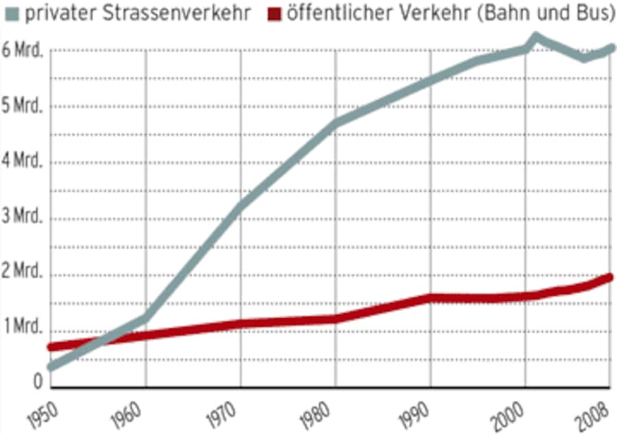 Verkehrspolitik war in den vergangenen 30 Jahren vor allem ein Kampf der Systeme: Privatverkehr gegen öffentlichen Verkehr. Die ökologischere Bahn wurde massiv gefördert, gleichzeitig wurden aber Strassen aus- und neu gebaut. Das Ergebnis ist ernüchternd: Eine Verlagerung hin zum öffentlichen Verkehr ist erst seit wenigen Jahren messbar, und das immer noch auf tiefem Niveau. Unter dem Strich fahren weiterhin knapp 80 Prozent mit dem Auto, gut 20 Prozent mit dem Zug. Es sind insgesamt einfach immer mehr geworden.