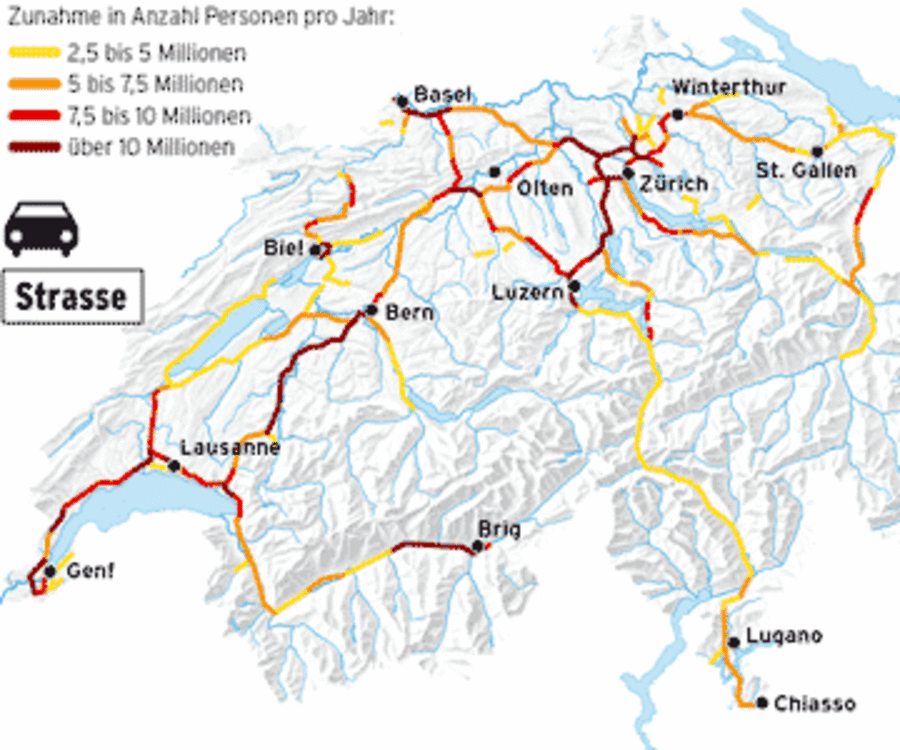 35 Millionen Stunden haben Autofahrer 2005 stehend verbracht – 75 Prozent mehr als zehn Jahre zuvor. Die Kosten für Arbeitsausfälle sowie die Energie-, Umwelt- und Unfallkosten belaufen sich gemäss Schätzungen des Departements für Umwelt, Verkehr, Energie und Kommunikation (Uvek) auf jährlich gegen 1,5 Milliarden Franken. Dagegen treten Bund, Kantone und Gemeinden mit massiven Investitionen an. 180 Milliarden sollen es bis 2030 für Ausbau und Unterhalt der Strassen sein, rund 80 Milliarden für die Bahn.