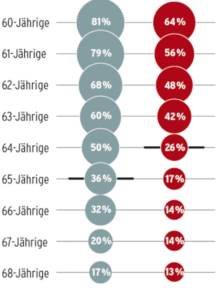Thomas Daum, Direktor des Schweizerischen Arbeitgeberverbands, ortet das grösste Problem bei der starren Altersgrenze, die in den Köpfen programmiert sei. Statt eines fixen Alters für den Ruhestand sollte nur noch das Referenzalter zur Bemessung der Versicherungsleistungen gelten, fordert Daum. Dieses Referenzalter würde er bei 67 festlegen. Auch Hans-Ulrich Bigler vom Gewerbeverband wünscht sich mehr Flexibilisierung für den Austritt aus dem Erwerbsleben. Dieser könne beim Alter von 62 oder nach einer obligatorischen Zahl von Beitragsjahren einsetzen und nach oben offen sein, müsse aber ohne Mehrkosten für die AHV ausgestaltet werden. Beide Kapitäne der hiesigen Arbeitgeberschaft sind überzeugt, dass die Verknappung von Arbeitskräften die Nachfrage nach älteren Arbeitnehmenden erhöhen wird. Eine Umfrage von Avenir Suisse bei Personalverantwortlichen von 804 Unternehmen zeigt allerdings: Bei freiwerdenden Stellen würden nur sechs Prozent der Firmen bei gleicher Eignung den älteren, über 50-jährigen Bewerber anstellen.