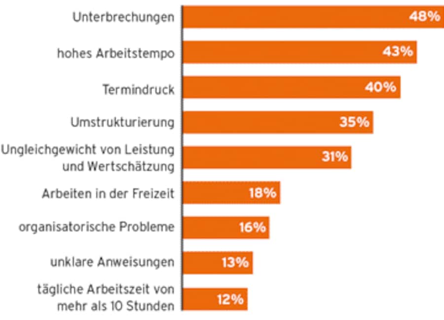 Welche Situationen dies im Arbeitsleben sind, hat das Seco genau untersucht. Es zeigte sich wenig überraschend: Es ist die gehetzte Wirtschaft, das Immer-unter-Strom-Stehen, das viele zermürbt. Dabei sind hohes Arbeitstempo und steter Termindruck nicht das Hauptproblem. Am meisten zu schaffen machen Arbeitnehmenden die dauernden Unterbrechungen: wenn es unmöglich wird, sich während einiger Stunden auf eine Arbeit zu konzentrieren, weil parallel dazu E-Mails beantwortet werden müssen und das Handy im Minutentakt klingelt.