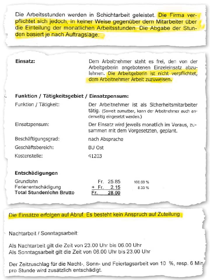Markus Hofer* arbeitet seit Jahren bei privaten Sicherheitsfirmen. Die Stimmung in den Teams sei oft schlecht, sagt er, es komme gar zu Mobbing: «Jeder hat Angst, plötzlich nicht mehr aufgeboten zu werden. Denn die meisten sind ‹Teilzeit auf Abruf› angestellt.» Das heisst: Firmen bieten Angestellte auf, wann und so oft sie sie brauchen. Eine Garantie für Arbeit gibt es nicht. Eine Anstellung im Monatslohn wäre für Hofer «fast wie ein Sechser im Lotto».