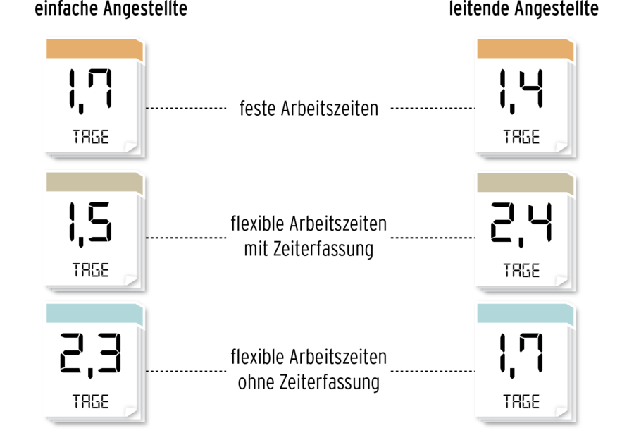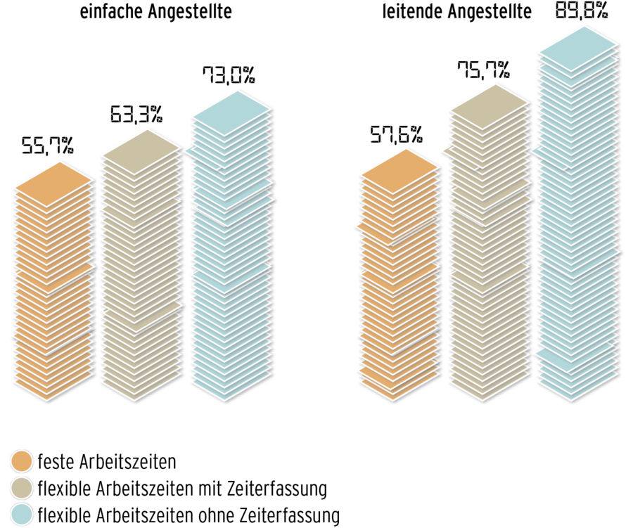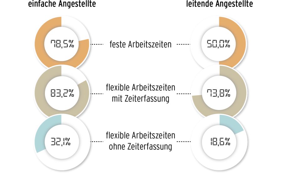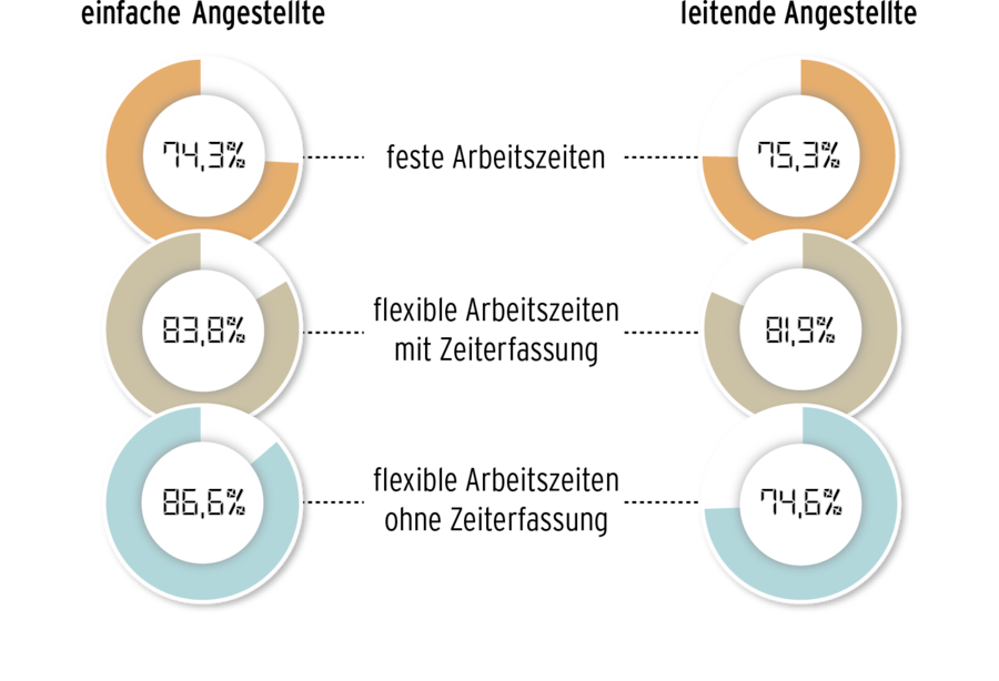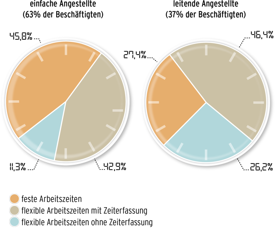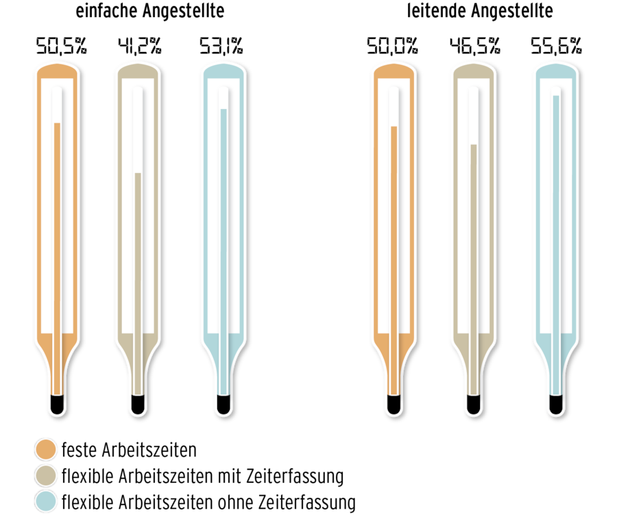 Flexible Arbeitszeiten ohne jede Zeiterfassung: Viele Angestellte befürworten das mit dem Argument, Familie oder Hobby und Beruf liessen sich so besser abstimmen. In einer Metastudie fanden angelsächsische Forscher Hinweise, dass es sich positiv auf das Wohlbefinden auswirkt, wenn man die Arbeitszeit selber bestimmen kann. Auch die im Auftrag des Seco durchgeführte Studie zu flexiblen Arbeitszeiten belegt: Angestellte, die ihre Arbeitszeit nicht erfassen müssen, sind mit ihrer Arbeit am zufriedensten.