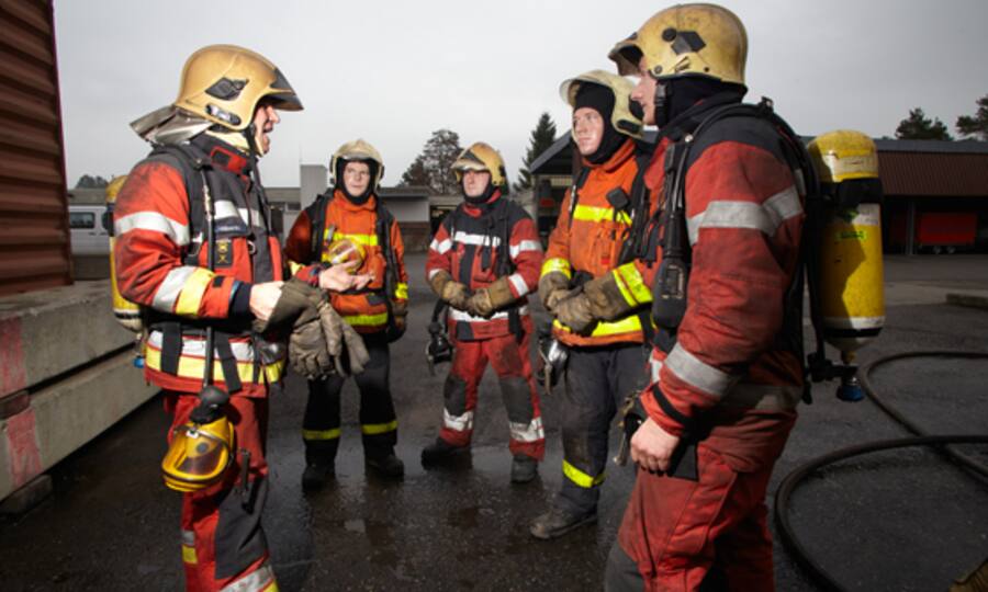 Nach dem Mittag geht es ins Brandhaus. Erste Übung: Ein Teil der Mannschaft muss sich über zwei Stockwerke samt Wendeltreppe durch dichtesten Rauch zum Brandherd vorkämpfen und das Feuer löschen. Sichtweite: 30 Zentimeter. Stolpern ist Programm, denn die Räume sind mit allerlei Requisiten ausgestattet. «Damit die Männer lernen, sich über den Tastsinn in den Räumen zu orientieren», erklärt einer der Instruktoren. Währenddessen arbeitet sich ein Teamkollege mit der Autodrehleiter zum «Brandopfer» vor, das an einem Fenster hängt. Die Simulationspuppe wiegt 75 Kilo. Sie alleine in den Korb der Leiter zu hieven ist Schwerstarbeit.