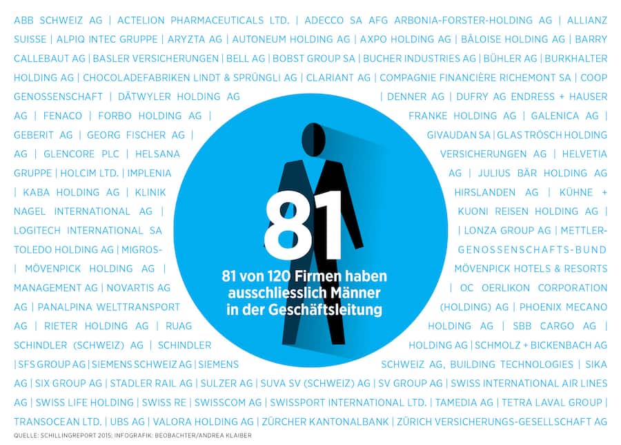 Hinweis: Der Schillingreport 2015 umfasst die 120 grössten Unternehmen der Schweiz, wobei sich die Grösse auf die Anzahl Mitarbeitender bezieht. Der aktuelle Report erhebt die Daten von 886 Mitgliedern aus 120 Geschäftsleitungen und 820 Personen aus 90 Verwaltungsräten.