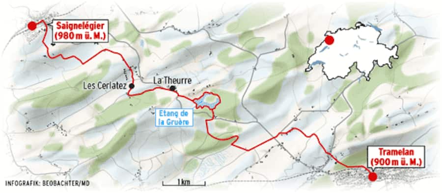 Die Strecke von Saignelégier über Les Cerlatez nach La Theurre und zum Etang de la Gruère ist beschildert, flach und in etwas mehr als einer Stunde zu bewältigen. Die Fortsetzung nach Tramelan dauert weitere anderthalb Stunden.