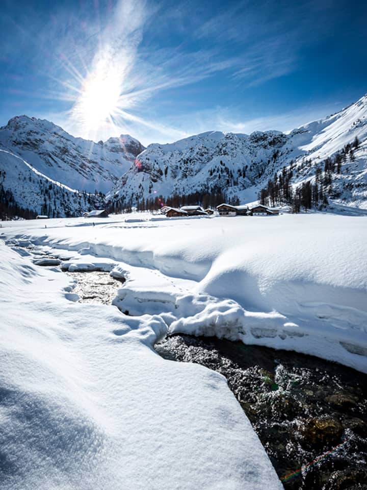 Im Winter führt die Wanderung von Davos Frauenkirch hinauf zur Mühle Sertig, weiter nach Sertig Dörfli und Sand.