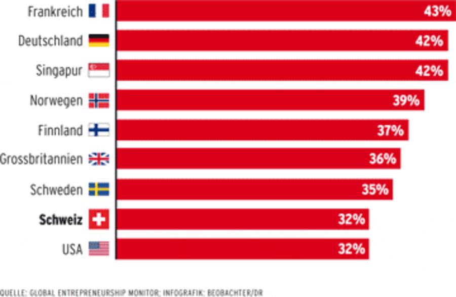 Laut Fachmann Rico Baldegger ist das ein typisches Verhalten: «Wer heute mit einer Firma scheitert, sieht das als Erfahrung, nicht als Gesichtsverlust.» Zwar hat die Angst vor dem Scheitern 2012 bei den Schweizerinnen und Schweizern wieder zugenommen – aber laut Statistik bewegt sie sich inzwischen auf dem gleich tiefen Niveau wie in den innovationsfreudigen USA. «Ein Start-up muss nicht immer ein Kampf ums Überleben sein. Es ist heute oft auch ein spielerischer Versuch, der scheitern darf und aus dem man für den nächsten lernen kann», so Baldegger. Mit dieser Sichtweise nähere sich die Schweiz dem US-Trend des Seriengründers, der eine Geschäftsidee nach der anderen umsetzt.