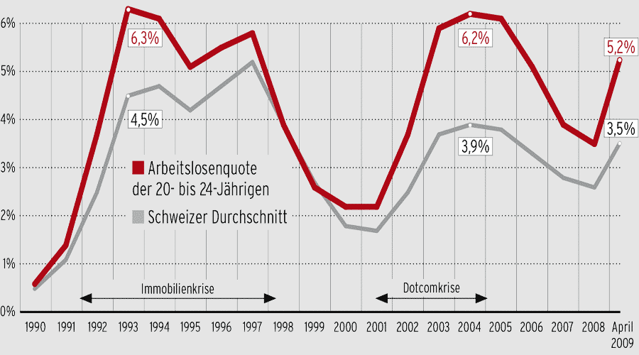 «Wir sitzen auf einer sozialen Bombe», sagt Christian Levrat angesichts der Massen junger Leute, die den Übergang ins Erwachsenenleben ohne berufliche Perspektive in Angriff nehmen müssen – obwohl die meisten eine solide Ausbildung hinter sich haben. Die drastische Aussage des SP-Präsidenten untermauert eine Tatsache: Der Berufseinstieg ist ein Krisenfall. Denn die Gruppe der 20- bis 24-Jährigen reagiert auf die Ausschläge der Konjunktur besonders sensibel; und wenn der Stellenmarkt austrocknet, wird die fehlende berufliche Praxis zur noch grösseren Hypothek.