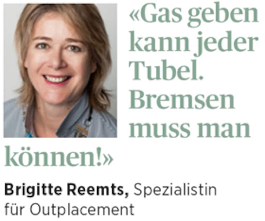 Statt an einen dauerüberlasteten RAV-Berater wende ich mich an eine ausgewiesene Spezialistin für Outplacement: an Brigitte Reemts, Partnerin beim Consulting-Unternehmen Dr. Nadig + Partner in Zürich. Sie weiss, wie man eine neue Stelle findet. Darauf hat sich die 52-Jährige spezialisiert. Was ich tun soll? «Ruhe bewahren», sagt Reemts. Ich solle mir den Ausspruch eines Lastwagenfahrers zu Herzen zu nehmen. Der habe ihr erklärt: «Gas geben kann jeder Tubel. Bremsen muss man können!»