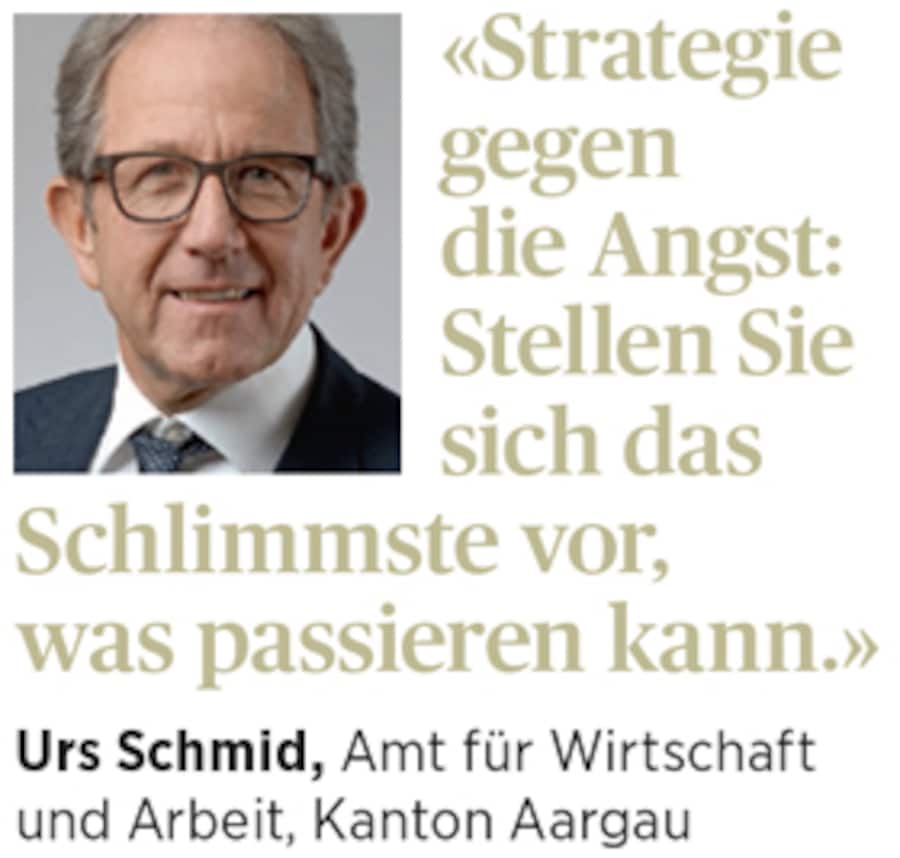 Wie ich mit meinen Ängsten umgehen soll, frage ich Urs Schmid vom Aargauer Amt für Wirtschaft und Arbeit. Der 62-Jährige hat vor drei Jahren jene Vorzeigekampagne für ältere Arbeitslose ausgeheckt, bei der Lüthi mitmachte. Meine Frage kontert Schmid mit einem handfesten Tipp: «Indem Sie so viel Geld auf die Seite legen, dass Sie ein Jahr lang davon leben können. Das gibt Ihnen Luft.» Und: «Indem Sie sich das Schlimmste vorstellen, was Ihnen passieren kann. Dann geht etwas vom Schrecken verloren.»