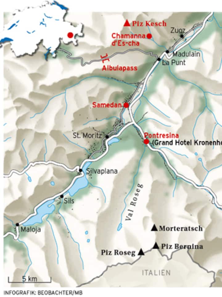 Zwischensaison im Engadin. Die Sonne noch wärmend, doch die weissen Bergspitzen und Reste des ersten Schnees auf der Via Maistra, der Dorfstrasse in Pontresina, zeugen davon, dass der Sommer vorüber ist. Die Natur ist hin- und hergerissen, noch plätschern die Brunnen, blühen die Pflanzen in den Balkonkästen, vereinzelt singen Vögel. Touristen mit umgebundener Jacke, man weiss ja nicht, wann die Kälte kommt.