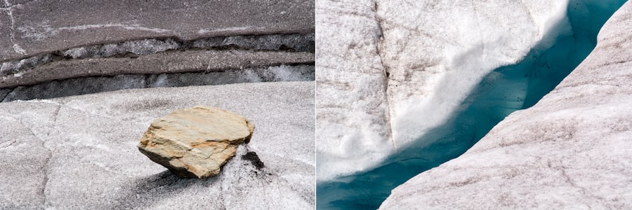 Nach etwa vier Stunden ist der Gletscherrand am Märjelensee erreicht. Spalten klaffen zwischen Hang und Eis, Schmelzwasser sprudelt, Abbruchkanten lauern und erlauben Blicke in eine dunkle, gähnende Tiefe. Nach kurzem Aufstieg über die Seitenmoräne bietet sich von der nun nordisch anmutenden Seenlandschaft nochmals ein herrlicher Ausblick zurück über die gesamte Route der letzten zwei Tage. Der flache Eisstrom schwingt sich eingebettet zwischen majestätischen Bergen als weisses Band sanft zu Tal. Wie lange noch?