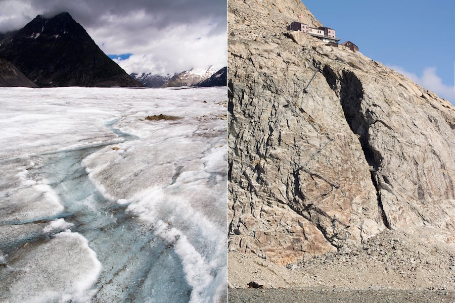 Die Treppe zur Konkordiahütte (rechtes Bild) muss stetig verlängert werden, da der Gletscher schrumpft.