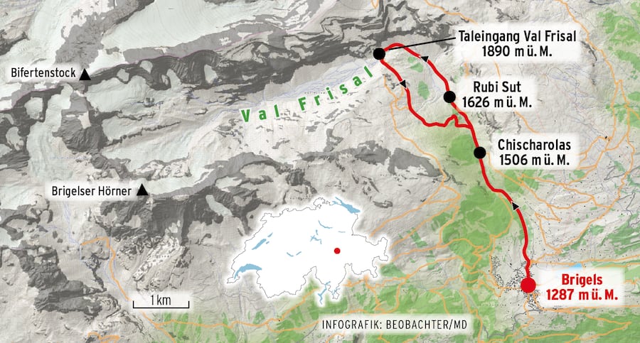 Route: Beschilderter Rundwanderweg nach Chischarolas – Rubi Sut – Taleingang Val Frisal – Alp Nova (nicht Alp Nova Sura!) – Chischarolas – Brigels. Marschzeit drei bis vier Stunden plus individuelle Erkundung des Val Frisal (keine markierten Wege). Gut 600 Höhenmeter hinauf und hinab. Wer die Sesselbahn Brigels–Crest Falla benützt, spart 300 Höhenmeter, aber nur wenig Marschzeit.