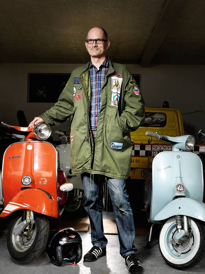 «Vespa, das ist Meer, Sonne, Ferien. Wer ‹Roman Holiday› (Ein Herz und eine Krone) mit Gregory Peck und Audrey Hepburn gesehen hat, weiss, wovon ich spreche. Vespafahren ist Lebensgefühl. Als einjähriger Knirps stand ich auf der Vespa meines Vaters. Meine erste eigene konnte ich mir mit 20 leisten. Inzwischen habe ich zwölf Stück und meine Leidenschaft zum Beruf gemacht: Ich führe einen Laden, in dem wir ausschliesslich Vespas flicken und verkaufen, mitsamt Zubehör, Helmen, Kleidern, Tassen, Büchern. Meinen Job als Grafiker habe ich an den Nagel gehängt. Ich liebe es, an der Vespa zu schrauben, ich liebe ihre Form, das Fahren. Mit dem Fanklub machen wir Ausflüge und fachsimpeln. Auf der Vespa fühle ich mich einfach am freisten.»