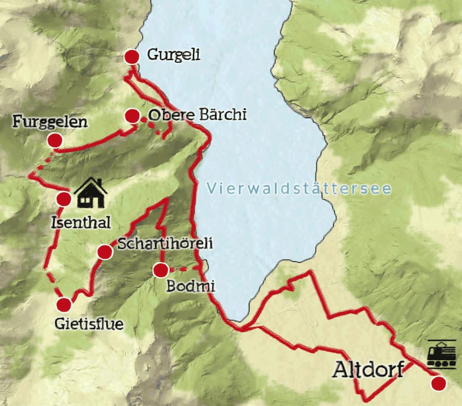 Erste Etappe Altdorf–Isenthal: Von Altdorf zum Vierwaldstättersee, dem See entlang zum Gurgeli und zur Seilbahn Vordere Bärchi, die zur Oberen Bärchi fährt. Nach einer Höhenwanderung gehts mit der Seilbahn von der Furggelen hinab ins Isental.