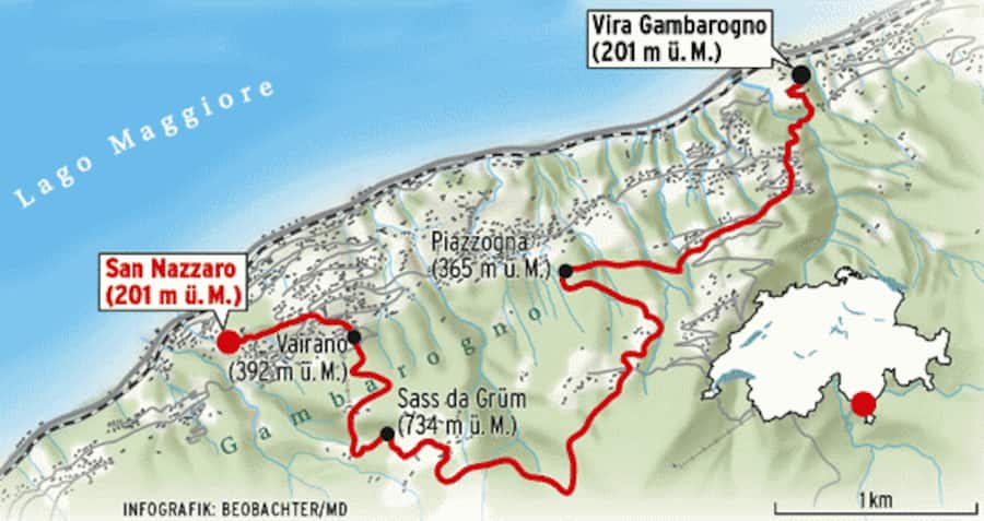 Gambarogno heissen das Ufer und der Hang gegenüber von Ascona und Locarno am Lago Maggiore. Diese Seite des Sees ist weniger überfüllt, weniger aufgeregt, bodenständiger, urtümlicher. Einmal auf dem Höhenweg angekommen, hat man einen weiten Blick über den See, die Magadinoebene, das Verzascatal, das Maggiadelta, die Brissagoinseln. Und auf das Ausmass der Bauwut, die an den Hängen gegenüber kaum grüne Flecken übrig gelassen hat.