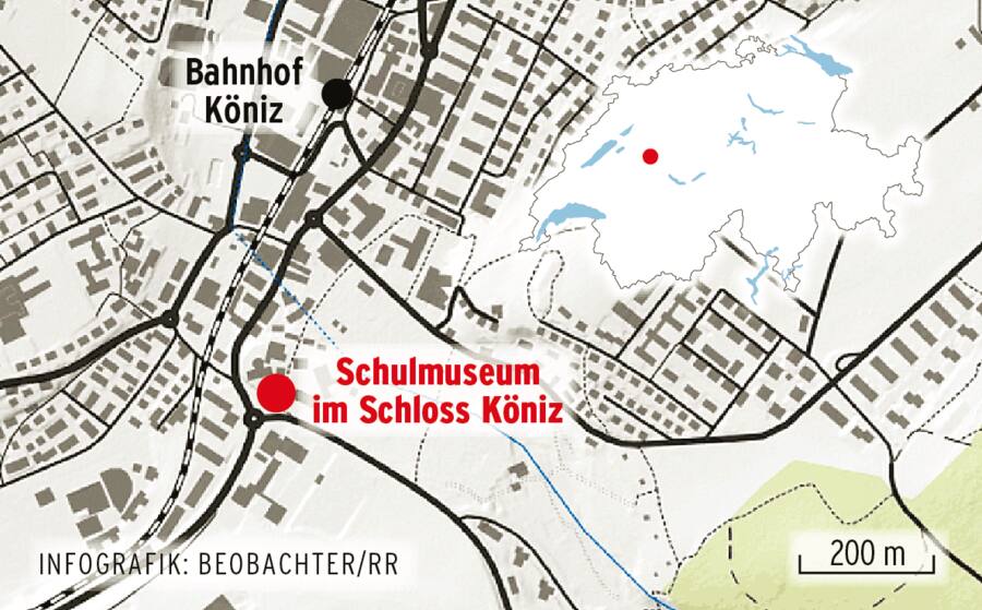 Doch die Szenerie ist jüngeren Datums: Das Schulmuseum Bern zeigt, wie Schweizer Klassenzimmer um 1940 aussahen. Die Dauerausstellung ist im Haberhuus des Schlosses Köniz untergebracht. Der Audioguide-Rundgang durch das historische Schulzimmer dauert 30 Minuten.