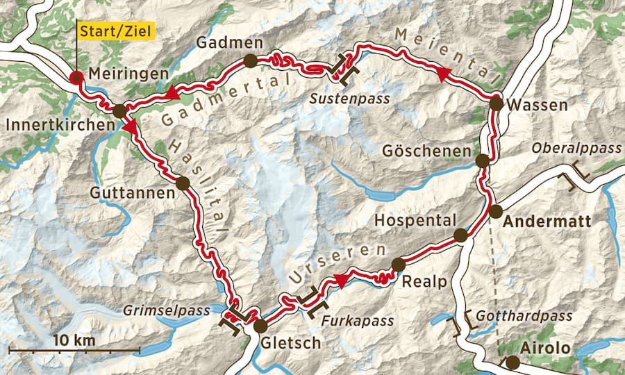 Ein bisschen Selbstüberlistung muss sein. Ich ziehe mir das gelbe Trikot über, das bei der Tour de France jeweils der Führende der Gesamtwertung trägt. Es darf wohl erlaubt sein, eine Prise des Hochgefühls von den Radprofis zu stibitzen. Vor allem wenn man sich vom Beobachter dazu hat überreden lassen, mit dem Rennrad die Pässe Grimsel, Furka und Susten in Angriff zu nehmen.