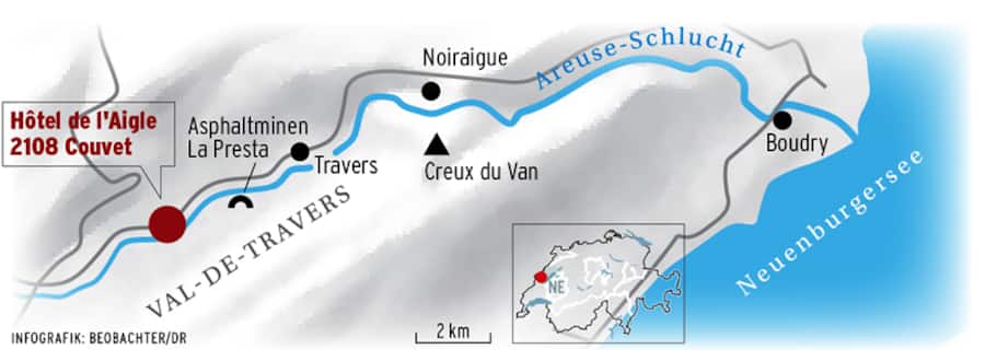Im holzgetäferten Saal des Hôtel de l’Aigle an der Hauptstrasse von Couvet sitzt einer, der mit beidem – der wirtschaftlichen Renaissance und den landschaftlichen Reizen – zu tun hat: Matthias von Wyss. Vor 18 Jahren ist der Bilingue aus der Stadt Neuenburg hinauf ins Tal der Areuse gekommen, um hier unter dem Label Goût & Région ein Konzept für sanften Tourismus zu etablieren. Was klein anfing, ist zu einem respektablen Unternehmen mit 55 Beschäftigten geworden; dazu ist Goût & Région ein führender Lehrlingsausbildner. Neben dem «Aigle» mit Restaurant und Hotel sind die Asphaltminen von La Presta ein weiteres Standbein des Tourismusprojekts. Dessen Stützpunkt befindet sich beim Bahnhof von Noiraigue, wo Velos (auch E-Bikes) vermietet und Führungen zu den Naturschauplätzen angeboten werden.