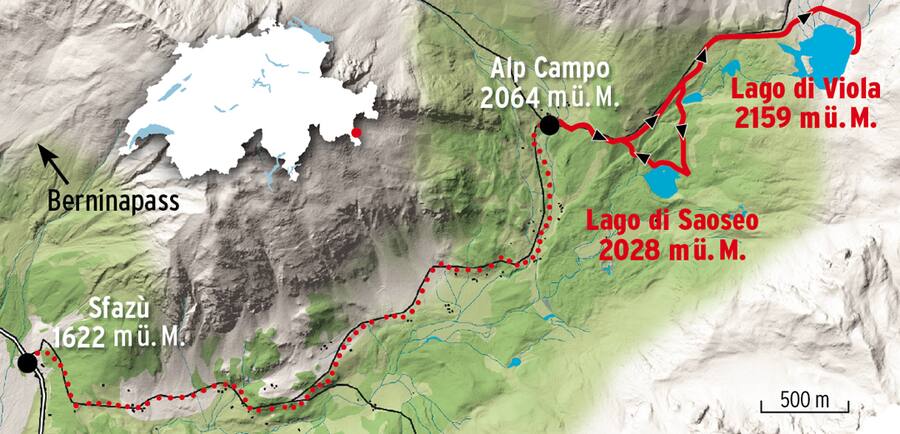 Es muss eine optische Täuschung sein. Doch nein: Es ist, wie es aussieht. Dunkelviolett, fast ein wenig plüschig schimmert das Wasser des Lago di Viola, passend zu den samtigen Weiden ringsherum. Und je nach Lichteinfall intensiv kobaltblau oder türkisgrün glänzt der glasklare Lago di Saoseo eine Mulde tiefer, ganz in der Nähe. Dahinter die zerfurchten Gratlinien der Cima di Saoseo, davor ein paar moosbewachsene Felsen und viele, viele Fichten. Die beiden kleinen Seen sind die visuellen Höhepunkte im Val di Campo, einem Seitental des Puschlavs, südlich des Berninapasses – also ziemlich abgelegen für fast alle Schweizer.