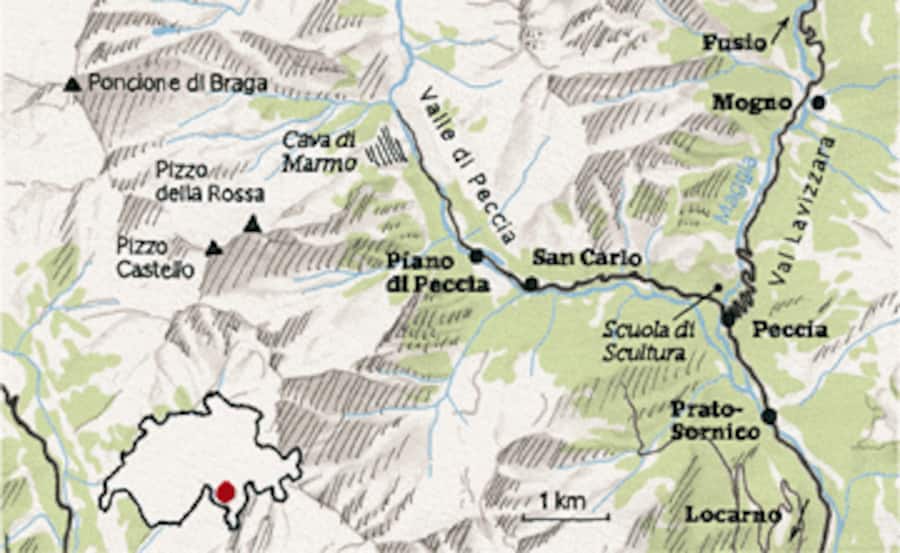 Der Blick zurück ins Tal offenbart im mächtigen Felsdreieck des Pizzo Castello die hellen Bänder des Marmors im dunklen Gneis. Und genau dieser Marmor findet sich dann wieder eingangs des Dorfes Peccia. Noch bevor wir die Maggia überqueren, erklingt von einer Anhöhe links eine seltsame Melodie: helles metallisches Meisseln, begleitet von dumpfem Hämmern. Wer den Tönen folgt, stösst auf einen geräumigen Werkplatz mit gedeckten Arbeitsplätzen und einem Laufkran für die Marmorblöcke. 15 Frauen und Männer arbeiten an ihren Steinen, betreut und beraten von Instruktoren. Zur Anlage gehören auch ein grosses Atelierhaus und Atelierappartements für Gastbildhauer, zudem eine Aula, eine Werkstatt und ein Lager.