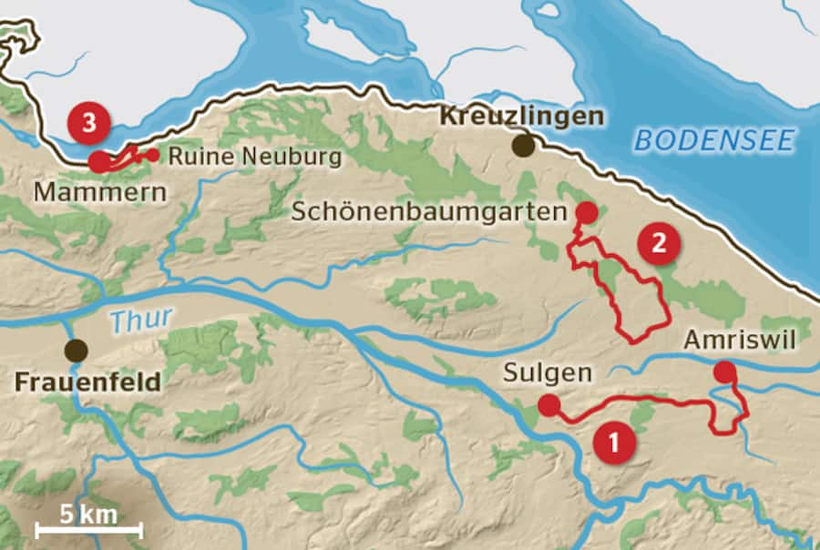 Sehenswertes: Die Route führt entlang von Obstgärten hinauf zur Chlingenegg. Vom Höhenweg aus blickt man auf den glitzernden Untersee. Nachdem man sich in der Ruine Neuburg umgeschaut und vielleicht bei einer der zwei Grillstellen in der Nähe Rast gemacht hat, geht es weiter zum Neuburg-Weiher und dem See entlang zurück nach Mammern.