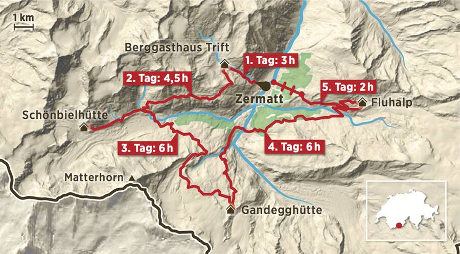 Die kurze Etappe zum Berghaus Trift ist ideal zum Einwandern und Akklimatisieren für die Fünf-Tages-Tour durch den Zermatter Gebirgskessel, die die zwei Wanderer in Angriff nehmen. Im Bann des Matterhorns, doch in aller Stille wollen sie die Natur erleben.