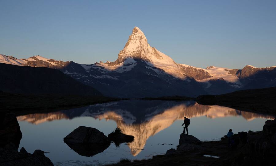 Abends ebbt der Rummel auch am Stellisee ab. Am Ufer betrachten zur Dämmerungszeit zwei Wanderer gedankenversunken die markante Silhouette des legendären Berges, während sich der Himmel langsam mit Sternen füllt. Es ist Ruhe eingekehrt.